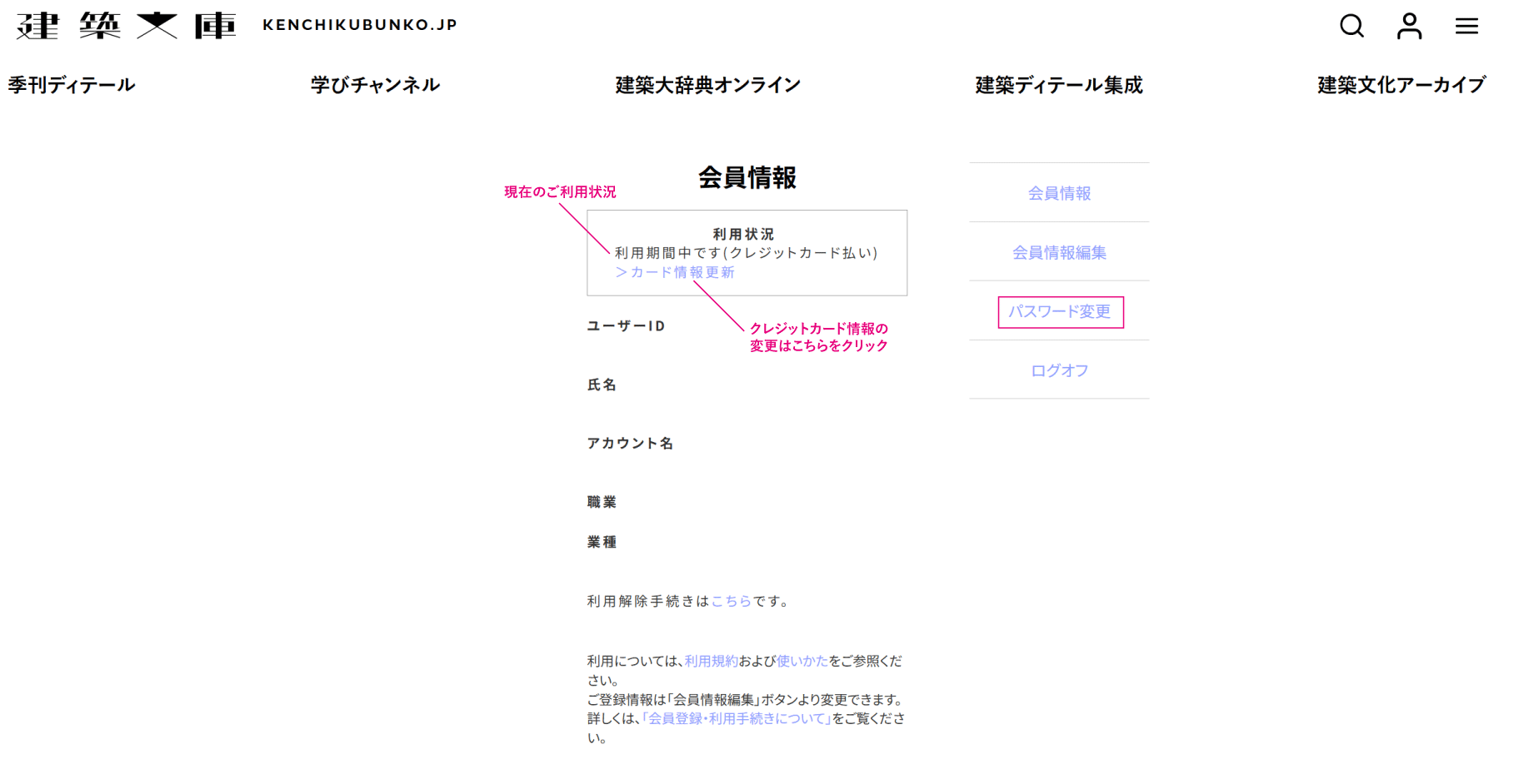 - 利用を停止したい場合、ログイン後に「会員情報」ページから、利用解除手続きを行ってください。利用解除手続き後も、利用期間中は閲覧可能です。